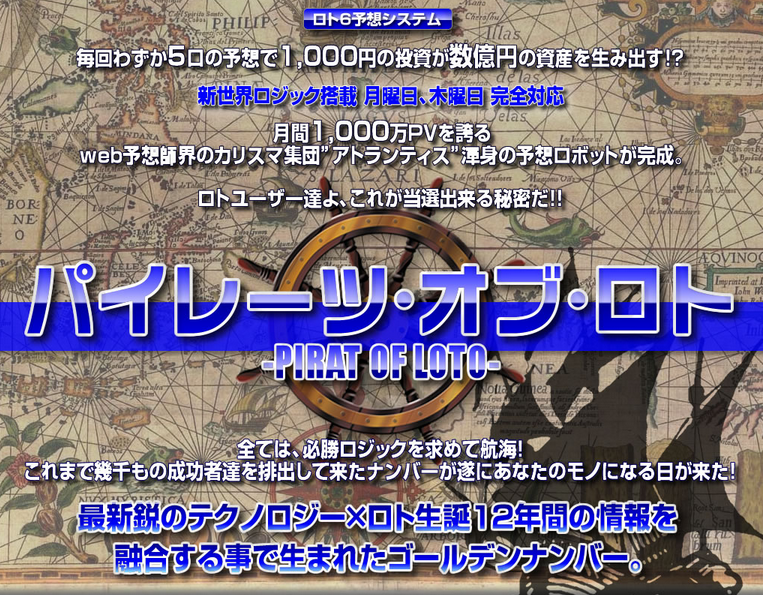 「ロト6予想システムパイレーツLOTO」は、独自のパターン解析を織り込んだ『新世界ロジック』と、同一数字の絞り込み解析を施した『オールブルーローンチ』を融合させて、1等・2等の高額当選や、3等・4等の連続当選を巻き起こすロト6予想ソフトです。